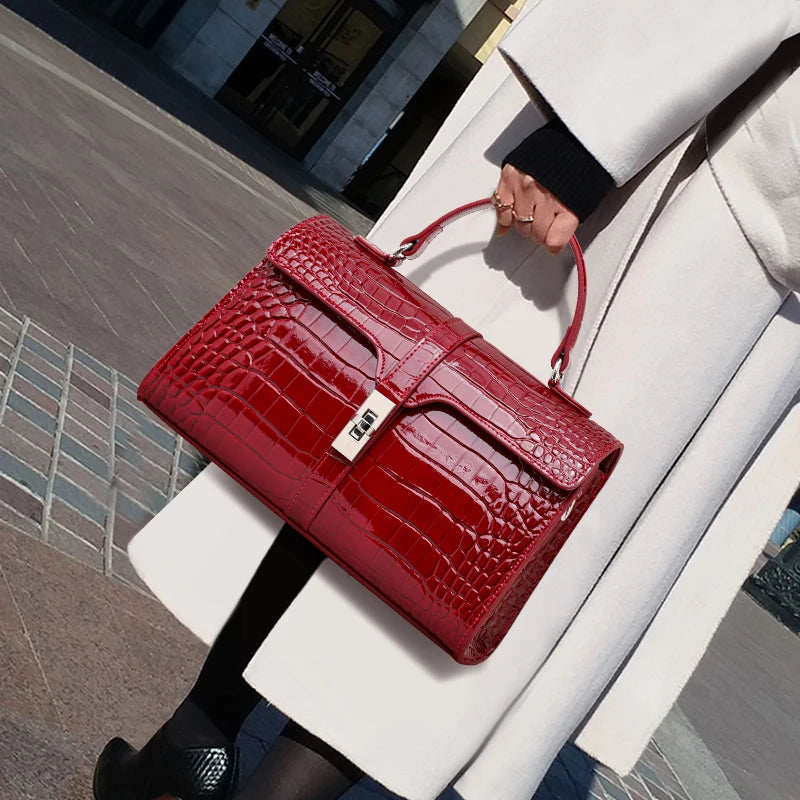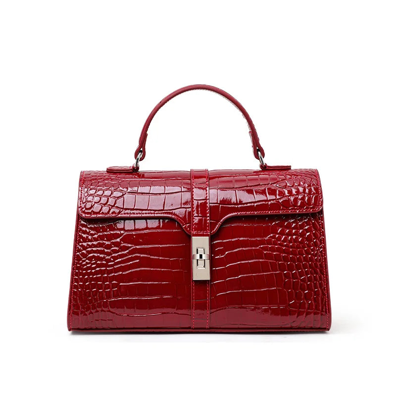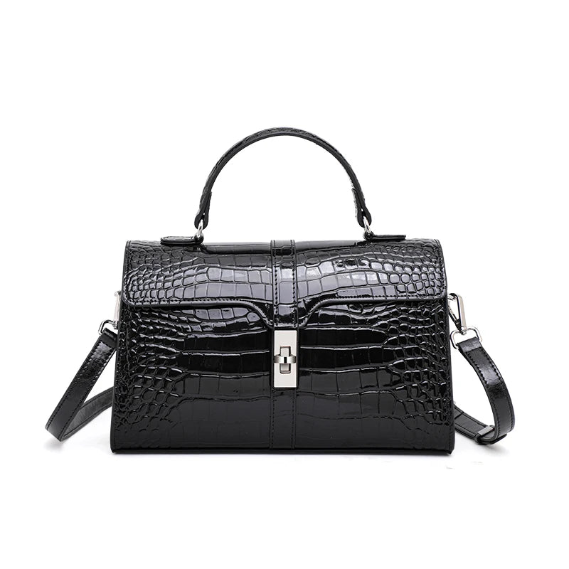 Diese Tasche verleiht deinem Look sofort einen Hauch von Luxus! Das geprägte Kroko-Design mit glänzendem Finish und dem silberfarbenen Drehverschluss sorgt für einen edlen Auftritt – ob im Büro oder beim Dinner-Date.