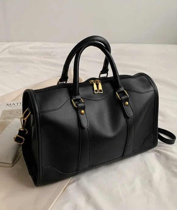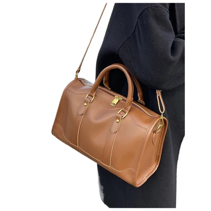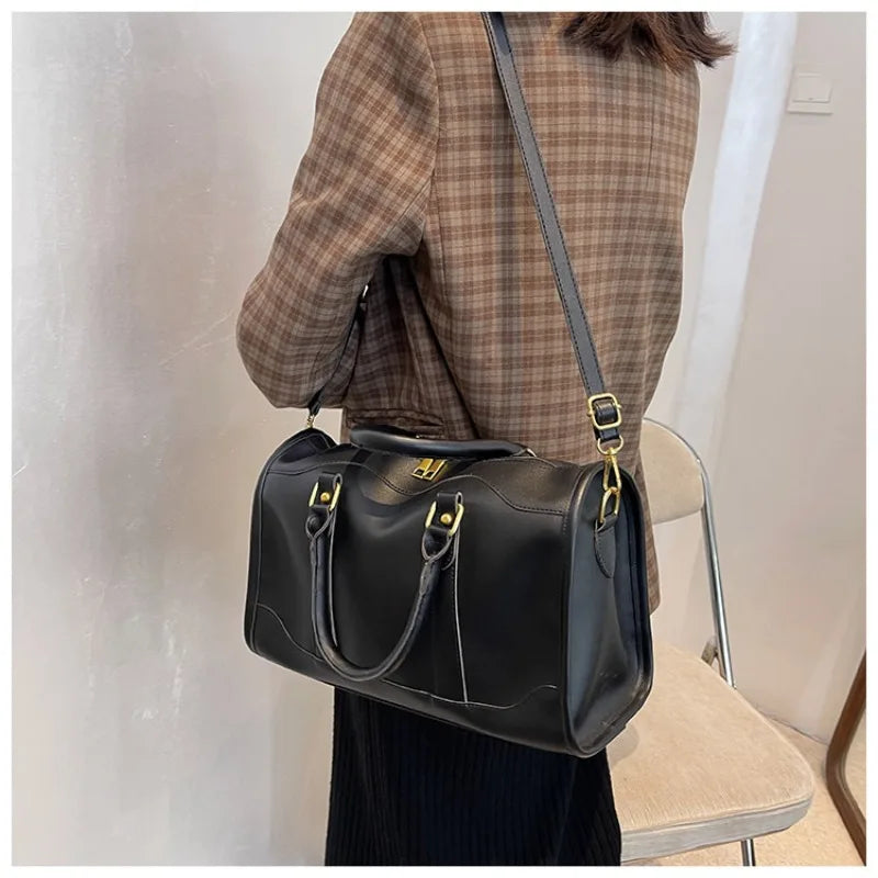 Gefertigt aus glattem, pflegeleichtem PU-Leder, bringt sie durch goldene Metallelemente und das stilisierte Schloss elegante Akzente in deinen Look. Der lange Schulterriemen ist abnehmbar – du entscheidest selbst, wie du sie trägst.